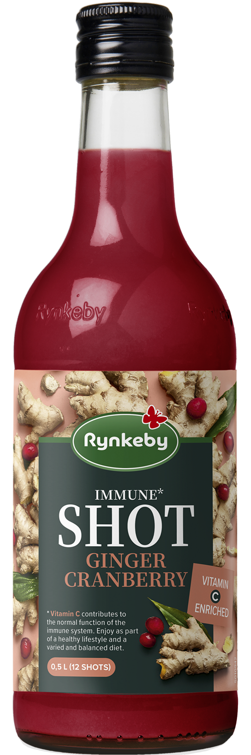 Med Rynkebys ingefära/tranbär-shot har vi satt ihop två karaktäristiska smaker. Först har vi pressat ingefära enligt en metod som bevarar den goda skarpa smaken, och sedan har vi lagt till ett stänk tranbär. Det ger en perfekt cocktail för dig som gillar en lite mildare shot, som har en utsökt och fräsch fruktsmak. Om du har svårt att komma igång på morgonen, hjälp dig själv med en ingefära/tranbär-shot som en del av den dagliga morgonrutinen. Din nya vana? Flaskan innehåller cirka 8 shot.